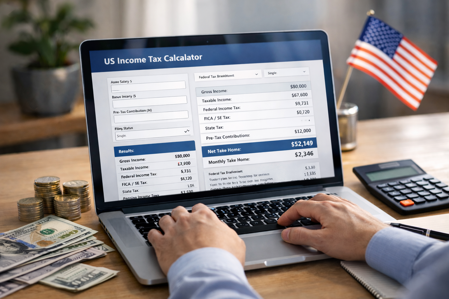 A US Income Tax Calculator is an online tool that estimates how much income tax and payroll tax you owe based on your earnings and filing status. It applies current federal tax brackets, standard deductions, and payroll tax rules to generate an estimated take-home amount.